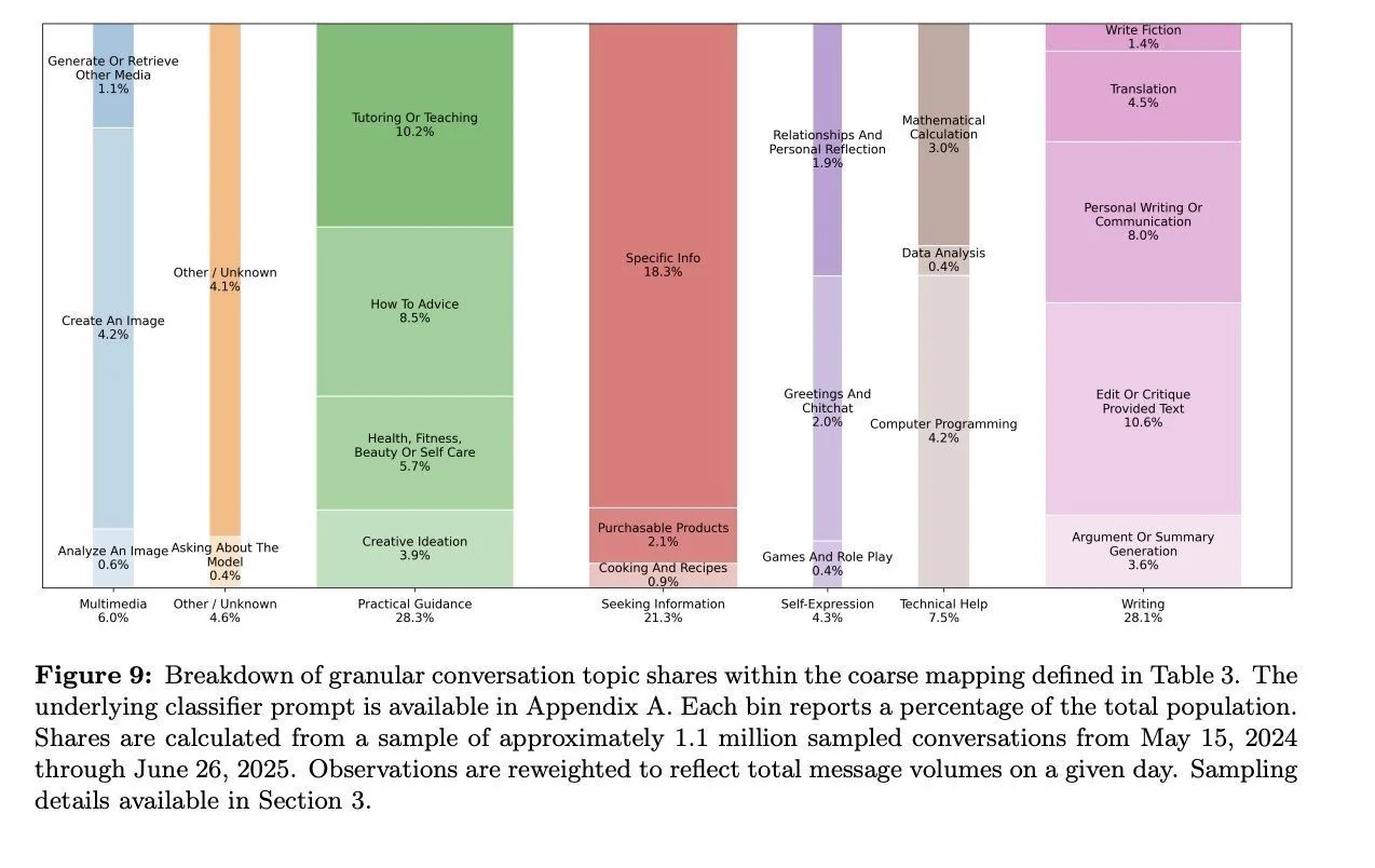 Além dos tópicos das conversas, os pesquisadores também usaram classificadores internos para entender os tipos de prompt mais usados.