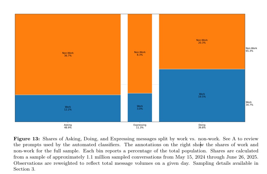 Os prompts que pedem para o ChatGPT fazer algo estão, geralmente, relacionados a uma tarefa ou processo produtivo. Já as perguntas estão relacionadas a facilitar um processo de decisão. Os prompts de autoexpressão têm pouco ou nenhum conteúdo economicamente relevante.