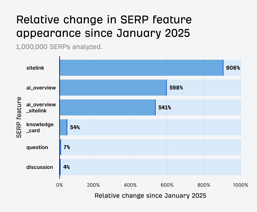 Além das AI Overviews, sitelinks demonstraram um crescimento enorme desde janeiro de 2025. Em muitos casos, ambos aparecem juntos.