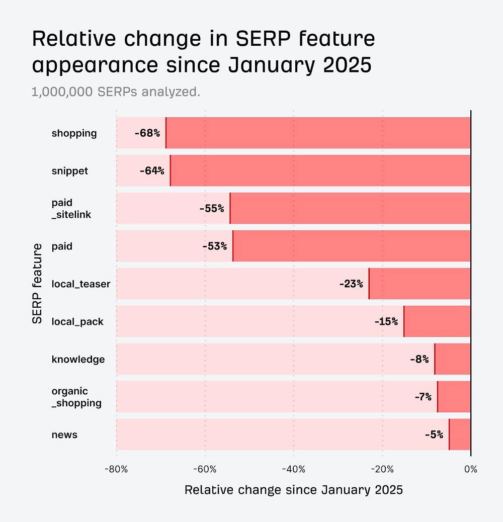 Por outro lado, cards do Google Shopping, snippets em destaque, sitelinks pagos e cards de mídia paga estão aparecendo menos do que em relação a janeiro de 2025.