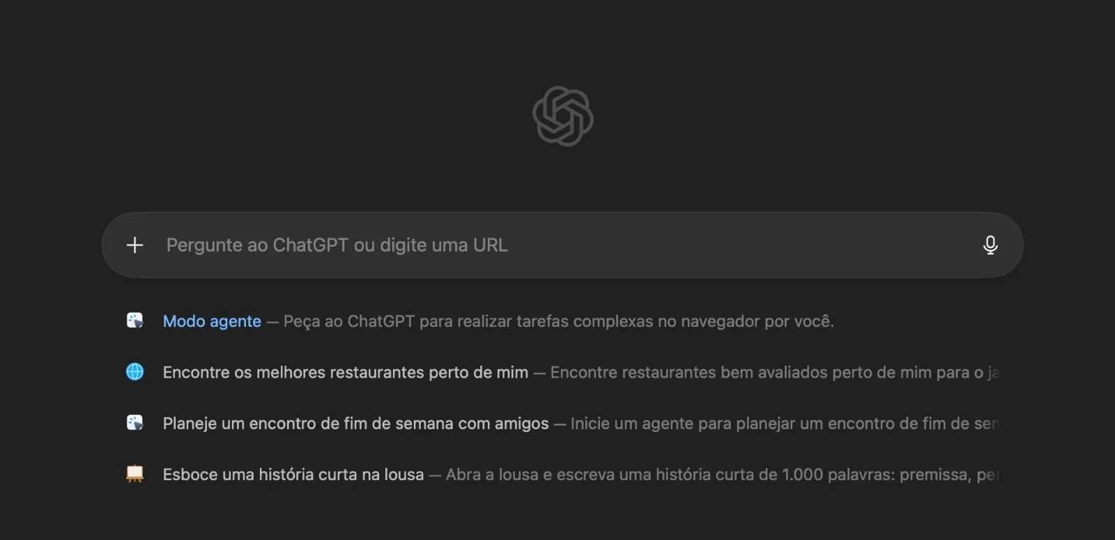 O Atlas é um navegador com o ChatGPT integrado. Depois de fazer o download, você precisa logar com a sua conta da OpenAI e é recebido com literalmente a mesma interface do ChatGPT padrão. O mesmo se repete sempre que você abre uma nova aba.