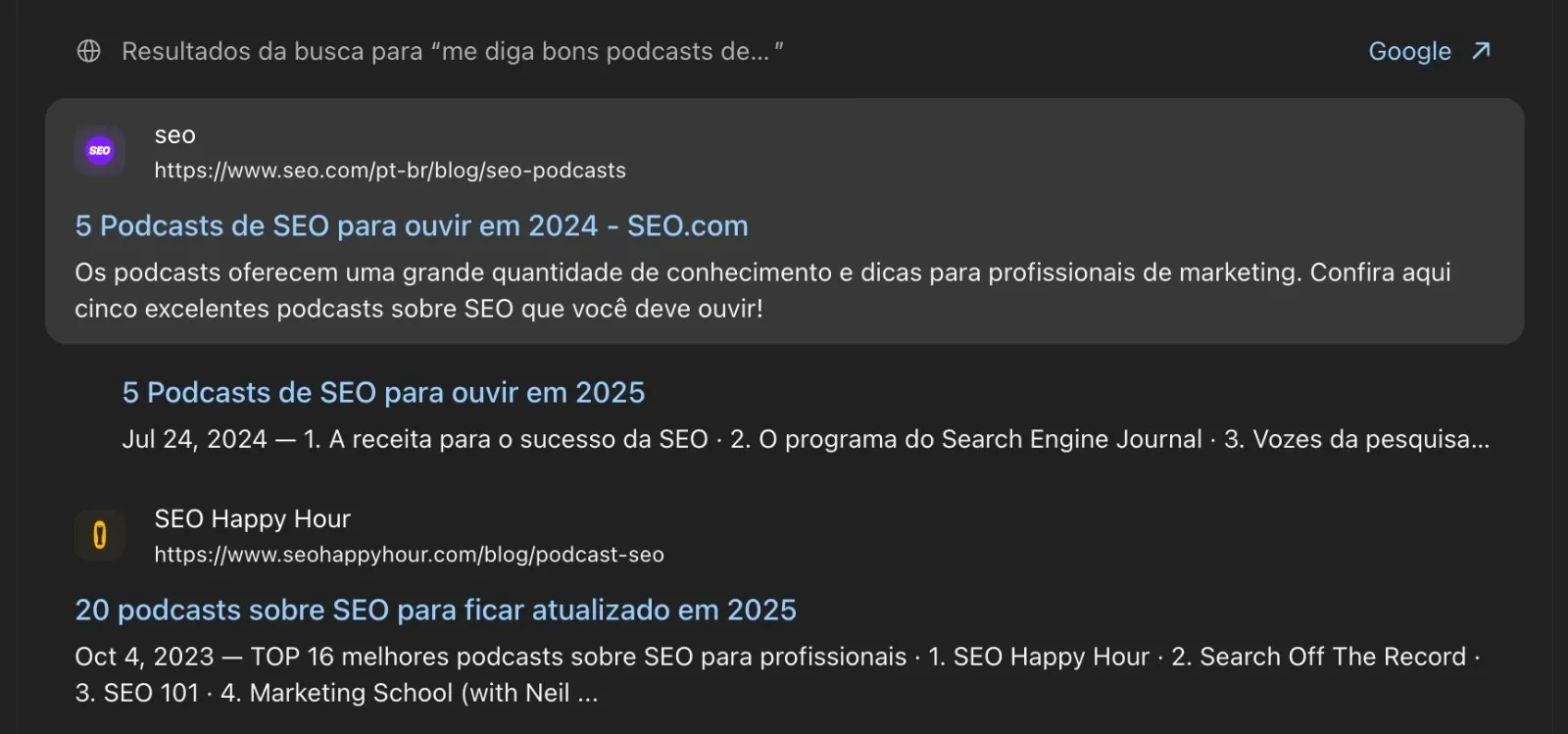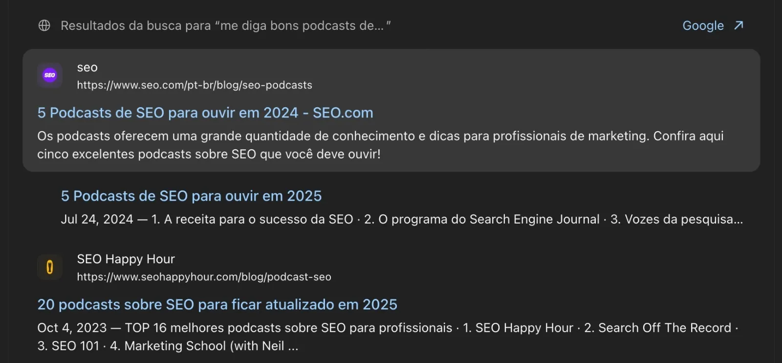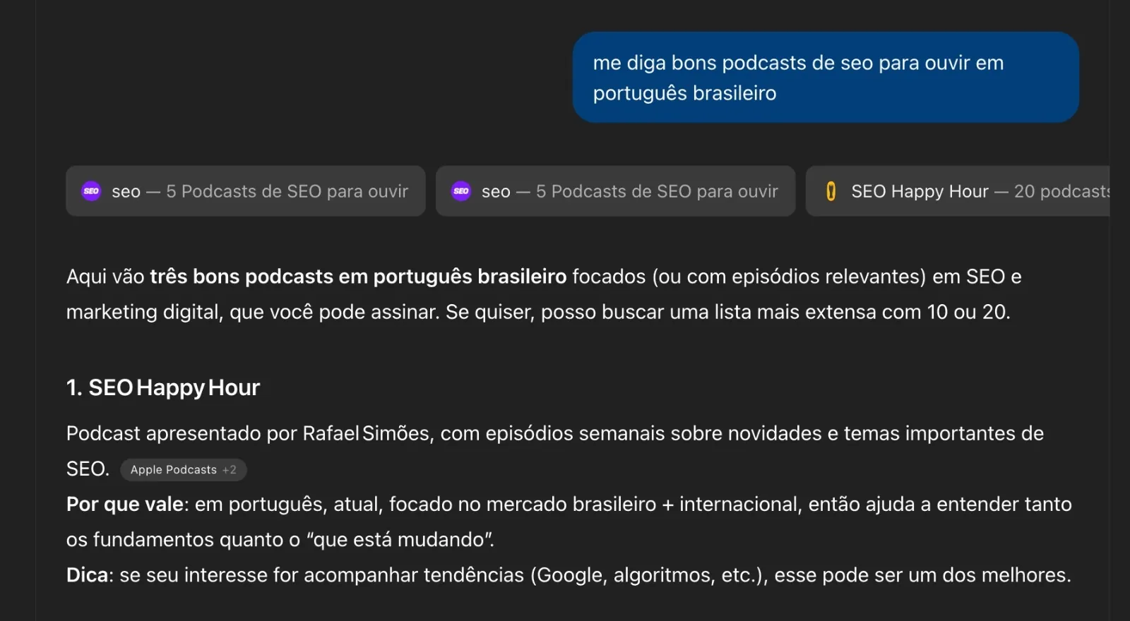 Um detalhe é que a posição das páginas muda. Por exemplo, nos resultados do ChatGPT, a SEO Happy Hour aparece em terceiro lugar para “podcast de SEO”. Já no Google, é o primeiro resultado.