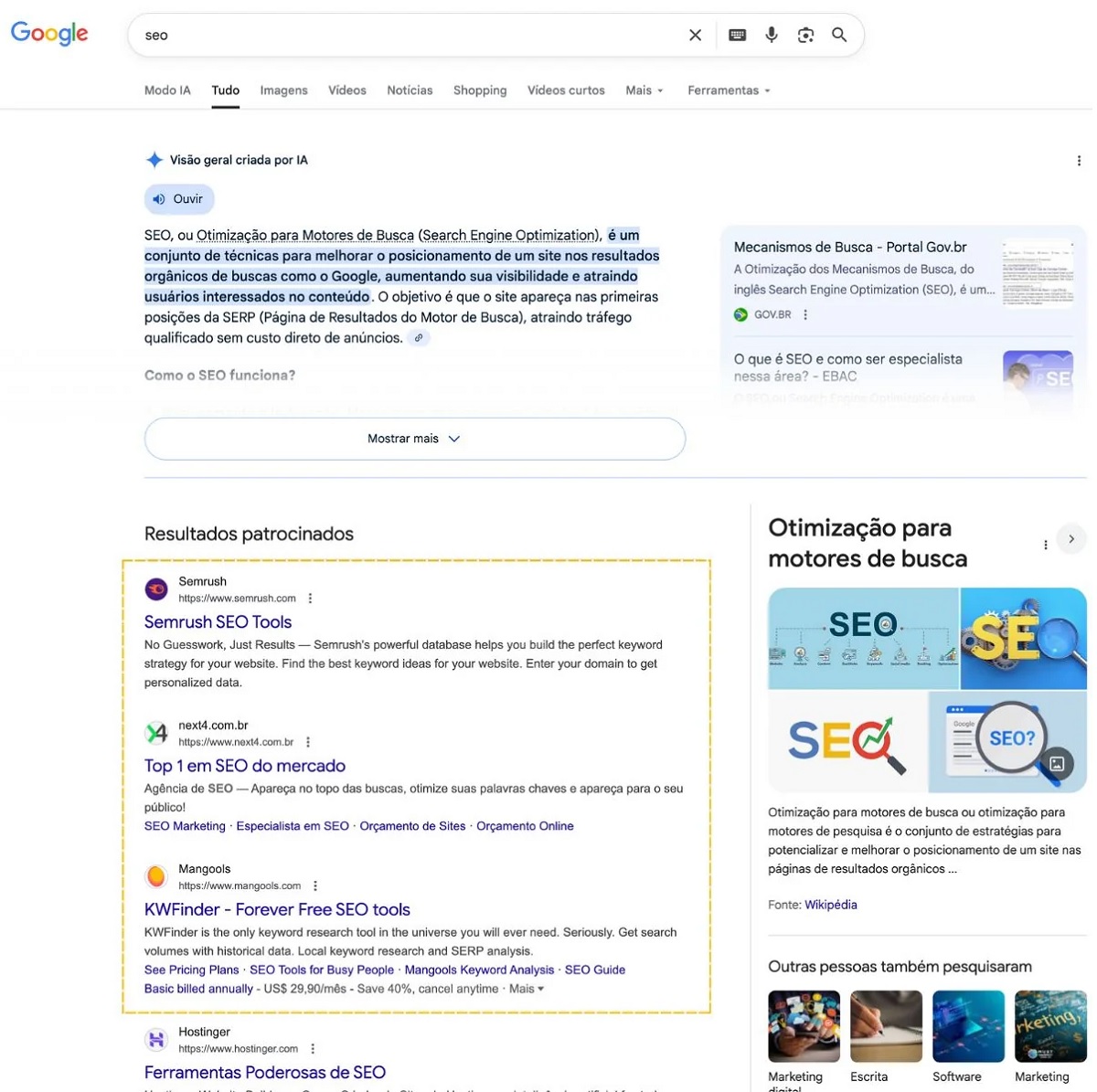Os anúncios na Pesquisa Orgânica estão de cara nova. Antes, eles eram marcados individualmente com a palavra “patrocinado”. Agora, aparecem agrupados em uma aba única.