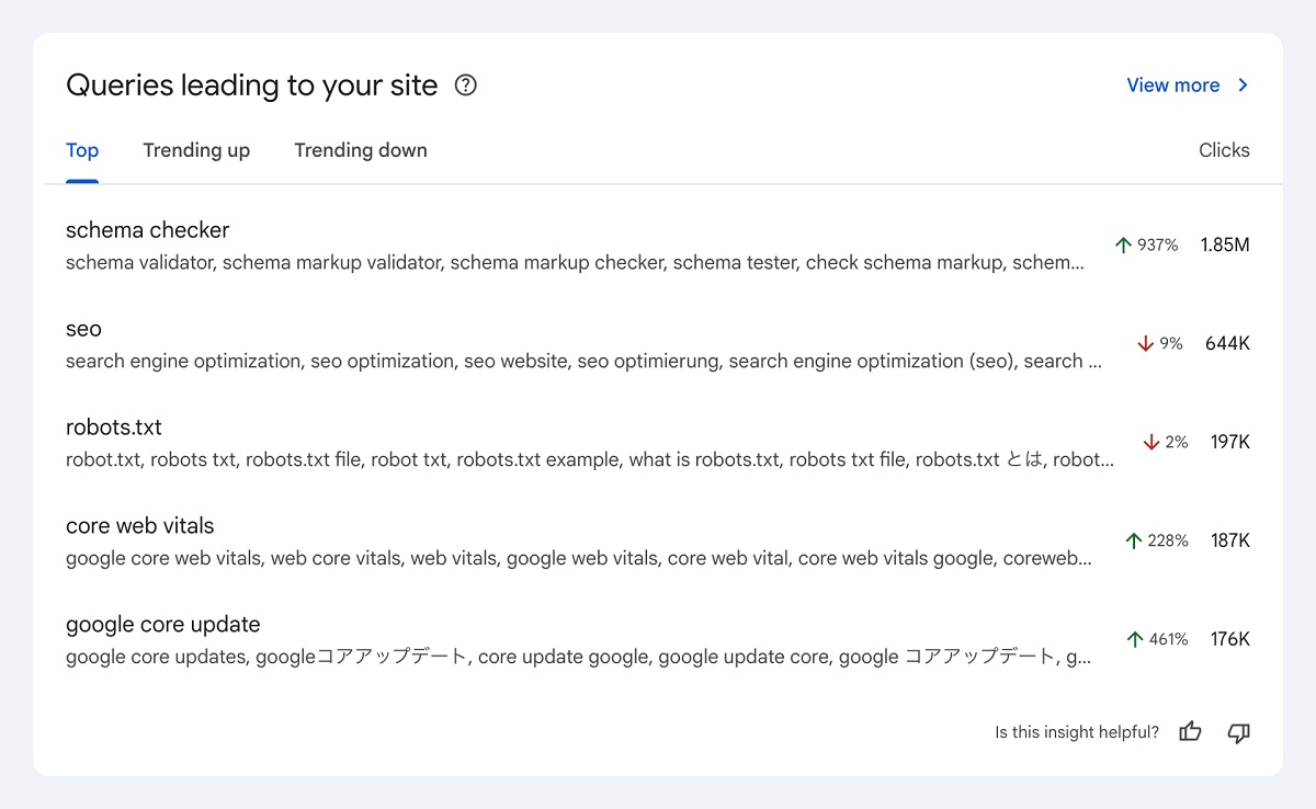 O volume de variações torna tediosa a identificação do interesse principal e o planejamento estratégico de conteúdo. Os grupos de consultas resolvem esse problema. Em vez de listas longas e desordenadas de pesquisas individuais, você verá listas representando os grupos que interessam à sua audiência. Esses grupos são feitos usando IA, podem evoluir e mudar ao longo do tempo.